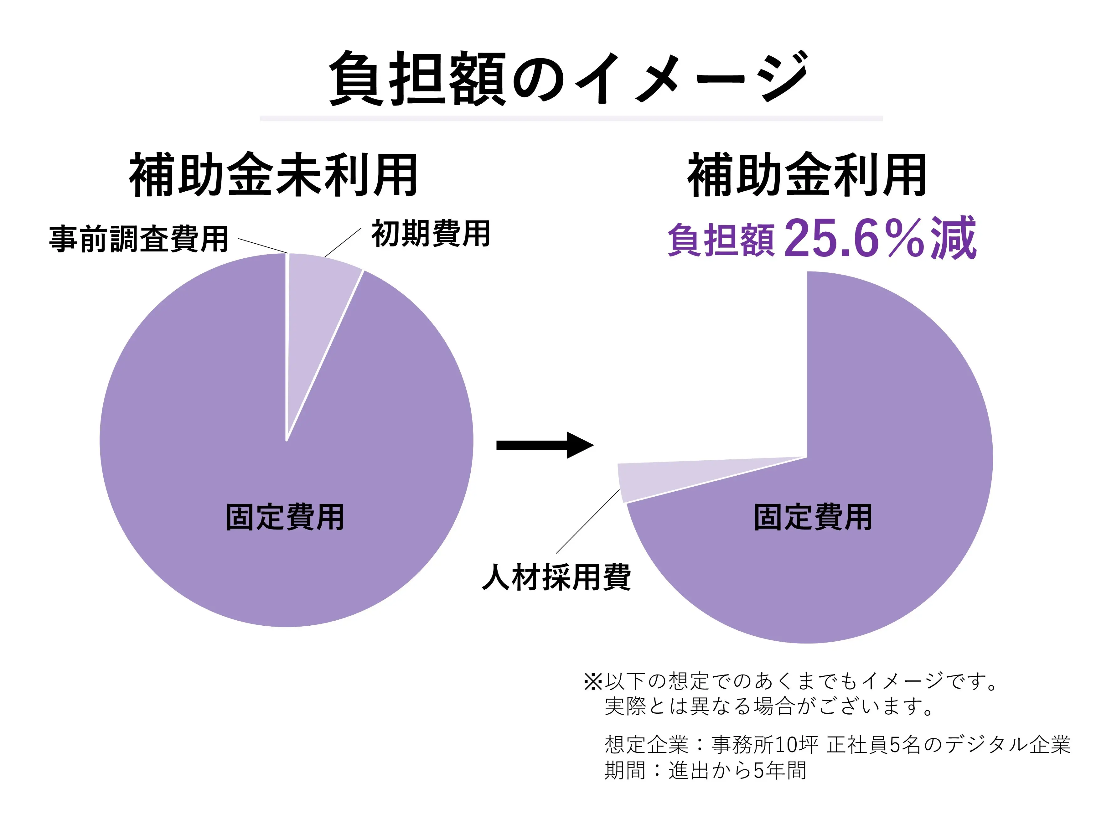 新潟県が実施している4つの補助金(※2)を全て利用した場合、事前調査費用と人材採用費を除く初期費用の全てと、人材採用費の20%、固定費用内の事務所賃料60%、年間給与の20%が補助されます。結果、当初の負担額が25.6%軽減されます。